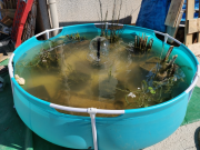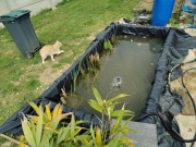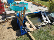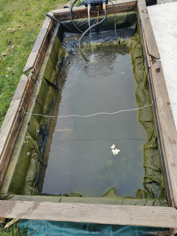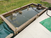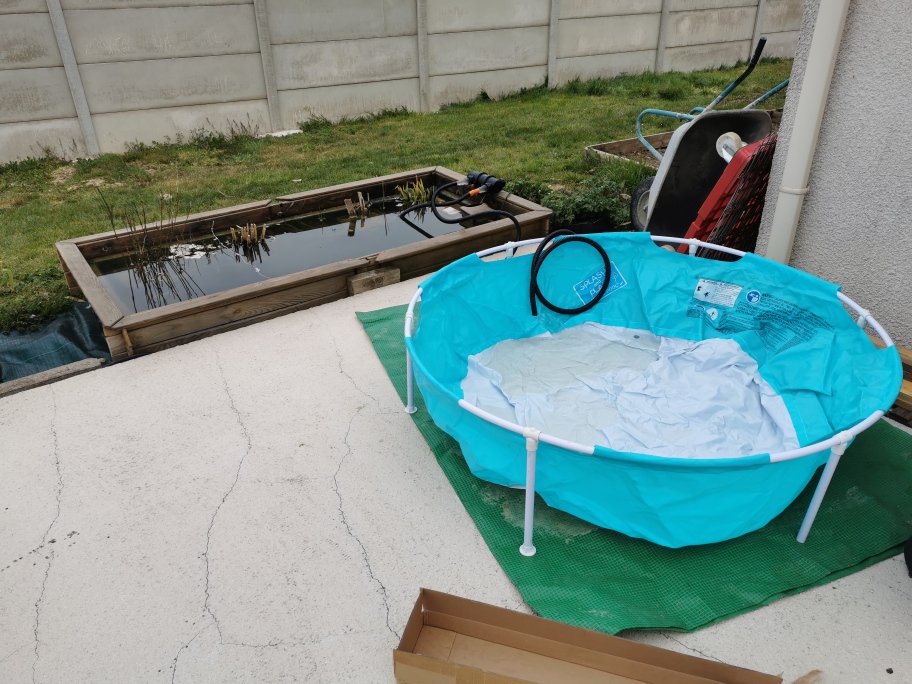 Transfert d'une partie de l'eau dans la piscine de mon fils afin de mettre les plantes et les poissons pour ne pas trop les stresser car il faudra que je creuse un peu :