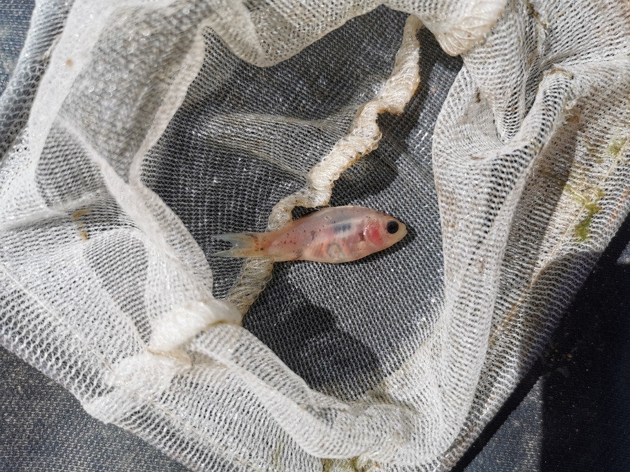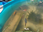Heureusement les températures du moments ne descendent pas trop la nuit ce qui permets aux poissons de ne pas avoir trop froid surtout que la piscine n'est pas très profonde, une trentaine de centimètres. Il découvre leur nouvel espace temporaire et n'ont pas l'air stressés :