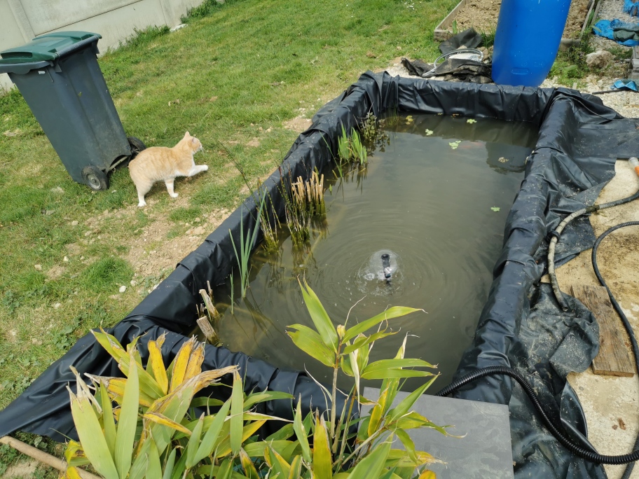 Mais cela me pose deux problèmes de taille... D'une part je vais perdre plus de 700L d'eau qui a déjà vécu, et d'autre part je vais décimer la biodiversité déjà en place... Outre les milliers d'asselles qui doivent arpenter le fond, j'ai vu pleins de larves de demoiselles, des vers et même des sortes d’araignées qui s'abritent dans des petits rouleaux de feuilles mortes... Ça me fout les boules, et j'aimerais trouver une solution pour les épargner... En attendant la suite, voici une photo de l'ouvrage :