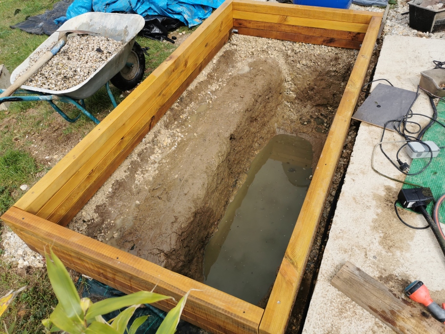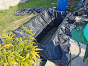 Après quelques coups de pioche, de pelles et beaucoup de sueur je peux maintenant mettre la nouvelle bâche. Et oui beaucoup de sueur car ça paraît pas mais passé 50cm de profondeur mon sol est fait d'argile bien collante et pleine de pierre, une vrai galère pour creuser.