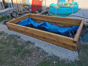 Ensuite j'ai retiré un peu de terre pour la remplacer par du calcaire afin d'éviter les mauvaises herbe. Je met enfin le nouveau contour, deux étages pour l'instant car c'est déjà super lourd. J'assemble ensuite les deux autres étages sur place. Et ce qui devait arriver arriva... La bâche est trop courte, je vais devoir en acheter une nouvelle et virer l'ancienne. Heureusement mon Jardiland est ouvert et à des bâches en stock.