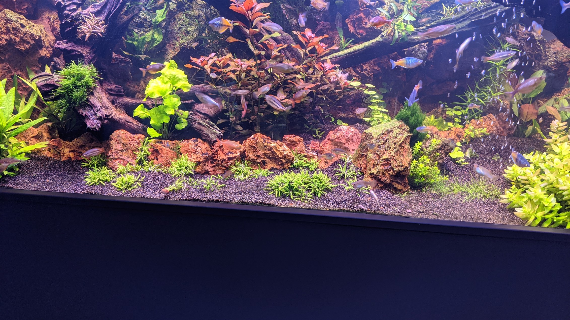 tilt, GP, le bandeau gris dans l'aquarium n'est effectivement pas très joli. Désolant qu'il n'y a plus d'algues dessus ( et ce n'est pas moi qui les aie frotté pour la photo  ). j'espère que les Pogostemon helferi (5 à 10cms) pourront les cacher. Sinon, il me faudra un plan B avec des plantes style eleocharis yokoscencis ?