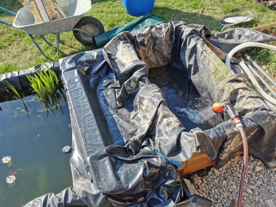 Ensuite j'ai réutilisé l'ancienne bâche du bassin. J'ai rempli pour vérifier s'il y a une fuite car elle a pas mal frottée contre les parpaings quand jai fait le "bassin de déchlorage" (je sais pas si c'est francais ça :D.