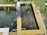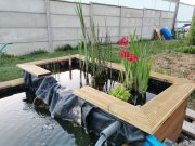 J'ai ensuite rempli de pouzzolane, mis des plantes et utilisé des lames de terrasse en bois pour la finition. D'ailleurs je suis dégouté car j'ai payé chaque lame de 2,40m 5 euros et c'est de la grosse m****. Elle se sont tordu dans tout les sens en quelques jours. Du coup il y a rien de droit. Mais bon vu le temps passé sur le bassin on verra plus tard pour changer ça. Il me reste maintenant à acheter un pompe avec un meilleur debit, genre 2000 ou 3000L/H afin qu'il reste un peu de débit en sortie de lagune. Il faut aussi que je trouve de quoi faire une jolie cascade, je pensais à des plaques d'ardoise. Voici le résultat actuel