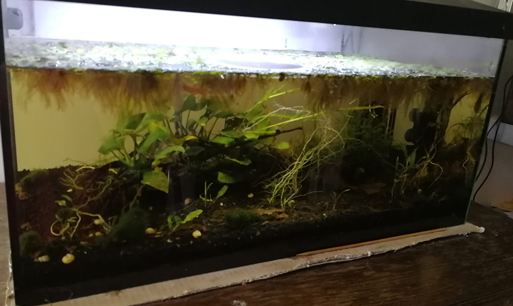 Bon, cyanobactéries sur les parois, algues pinceaux envahissant les Anubia, une des femelles Aphyosemion est morte sans que je sache pourquoi après s'être cachée pendant 2 semaines, l'autre se cache aussi donc pas bon signe non plus... Je vais vérifier les paramètres et faire un gros entretien. Ce qui est sûr, c'est que j'arrête l'aquariophilie, je ne suis décidément pas faite pour ça. Je vais juste me contenter de maintenir autant que je peux les vivants restants, mais quand ils finiront leur vie, je donnerais ou vendrais les plantes et le matériel.