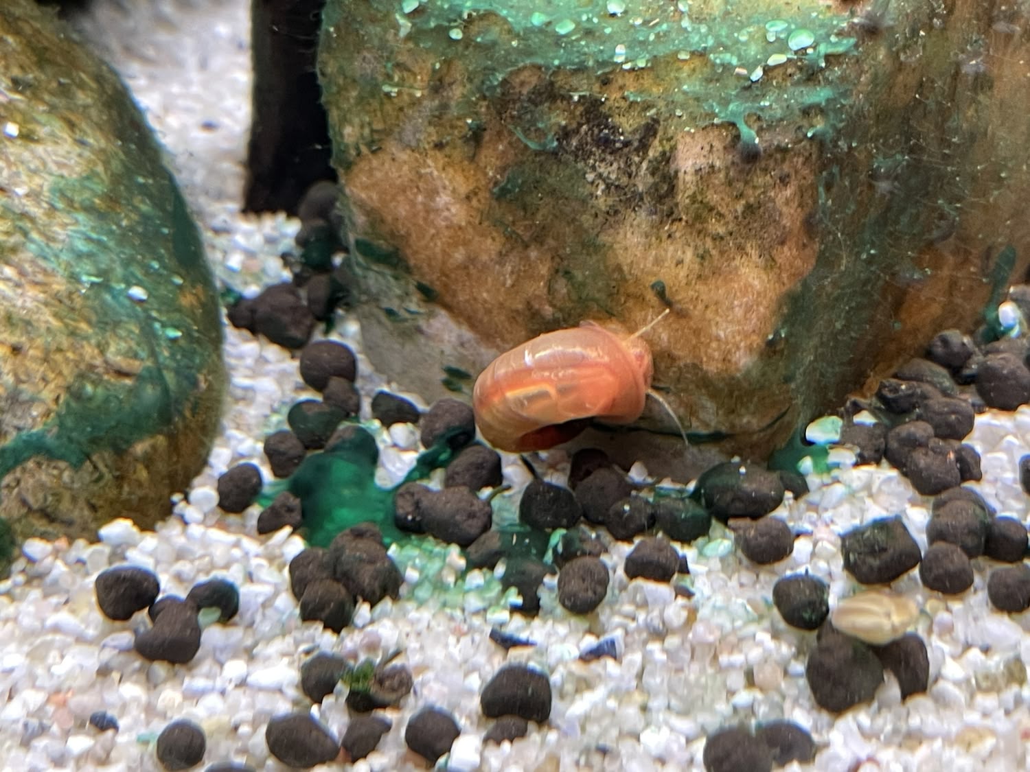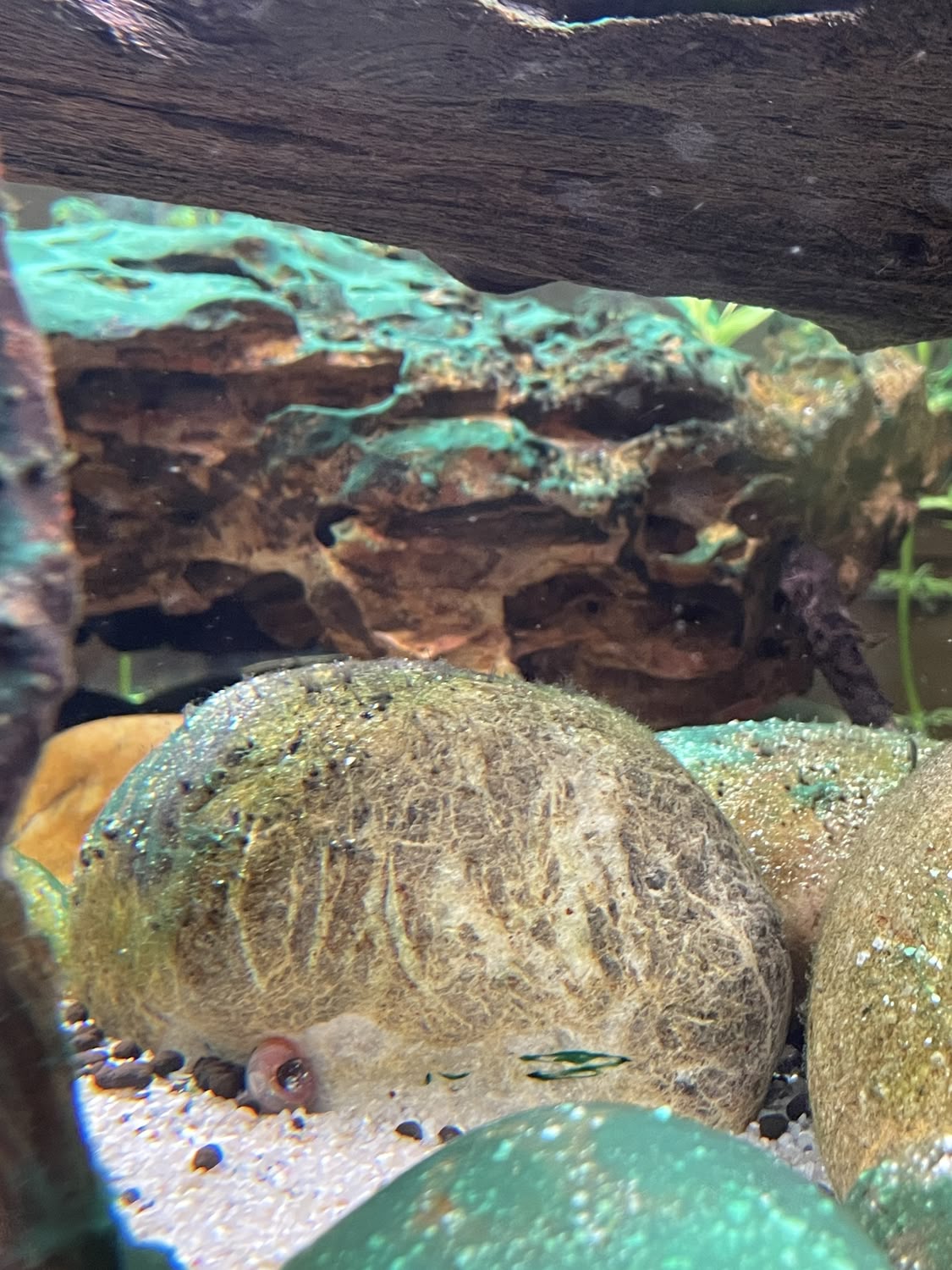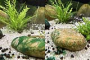 Sinon pour ce qui est des escargots "gloutons": Je sais qu'ils ne mangent pas la cyano, mais le résultat est là, c'est la même pierre à 3j intervalle, je ne sais pas qui s'en est occupé (Planorbes ou d'autres?) Peut-être qu'il y avait algue+cyano et que les deux ont été mangés en même temps?