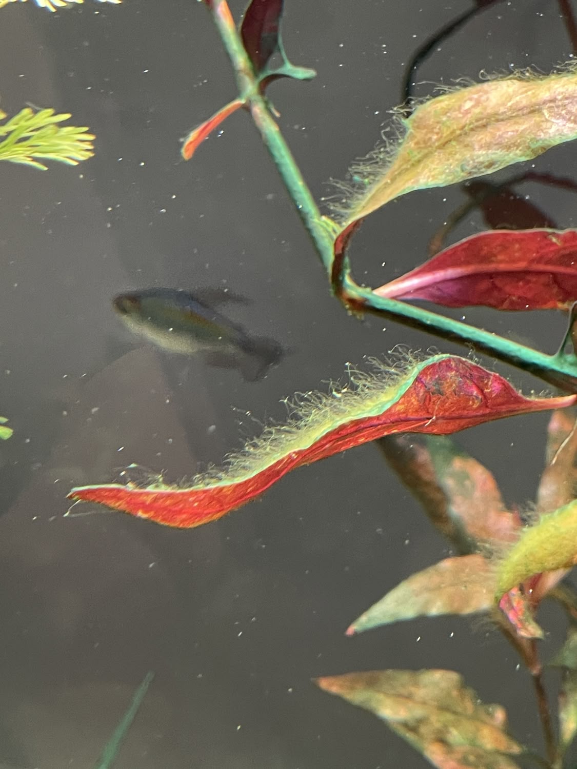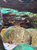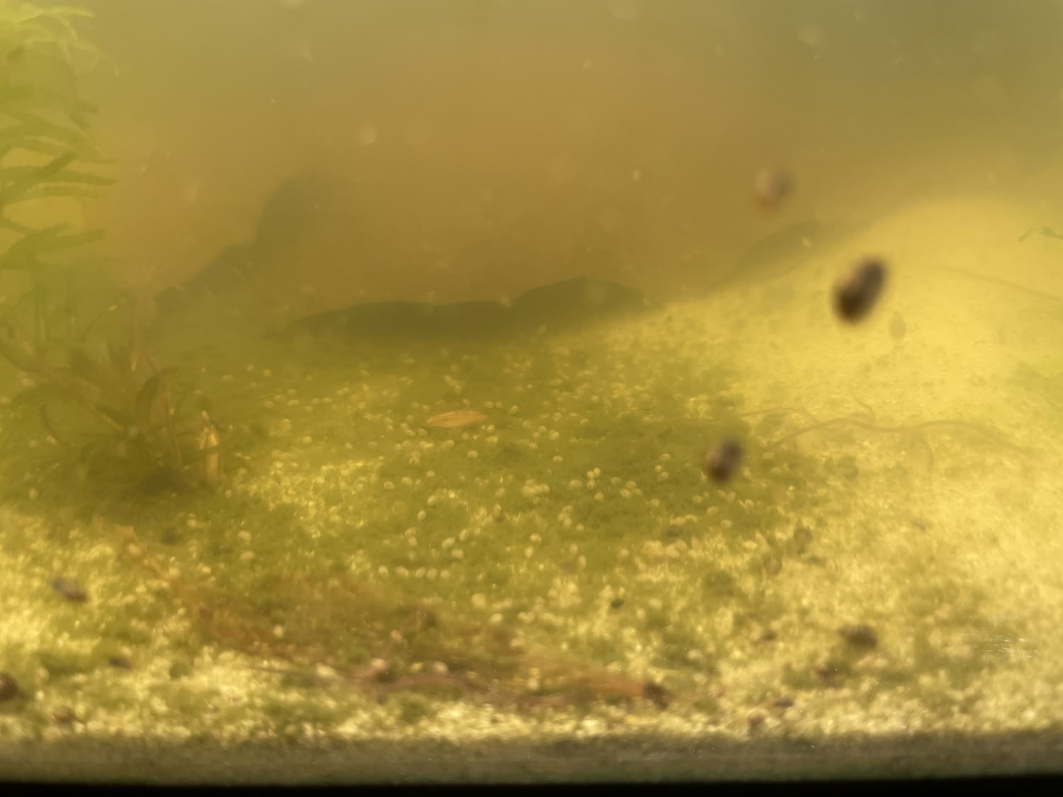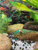 Sinon la Cyano semble lutter contre une autre algue, ou d'autres bactéries, les décors et plantes se couvre de grosse "peluches" vertes fonçée, presque noir, mais la cyano "vert-fluo" n'est plus visible, je ne sais dire si ce que je vois c'est une cyano couverte d'algue, ou une cyano morte. En tout cas la "peau" gluante qui couvrait certains endroits (j'imagine grosse concentration) a disparu. Les escargots et les crevettes semble se faire un festin d'algues.