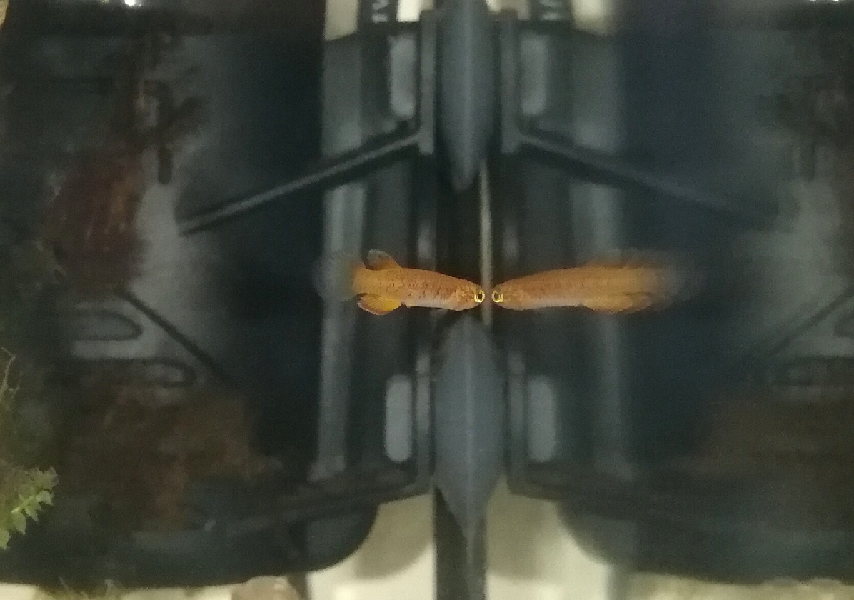Bonjour à tous, quelques nouvelles de la petite famille de mes Aphyosemion australe gold ! Rappel à ceux qui auraient la flemme de tout relire : on a 1 mâle d'origine, 1 femelle (la 3e introduite, la seule survivante), et 2 jeunes mâles issus de repro naturelle à quelques semaines d'intervalle.