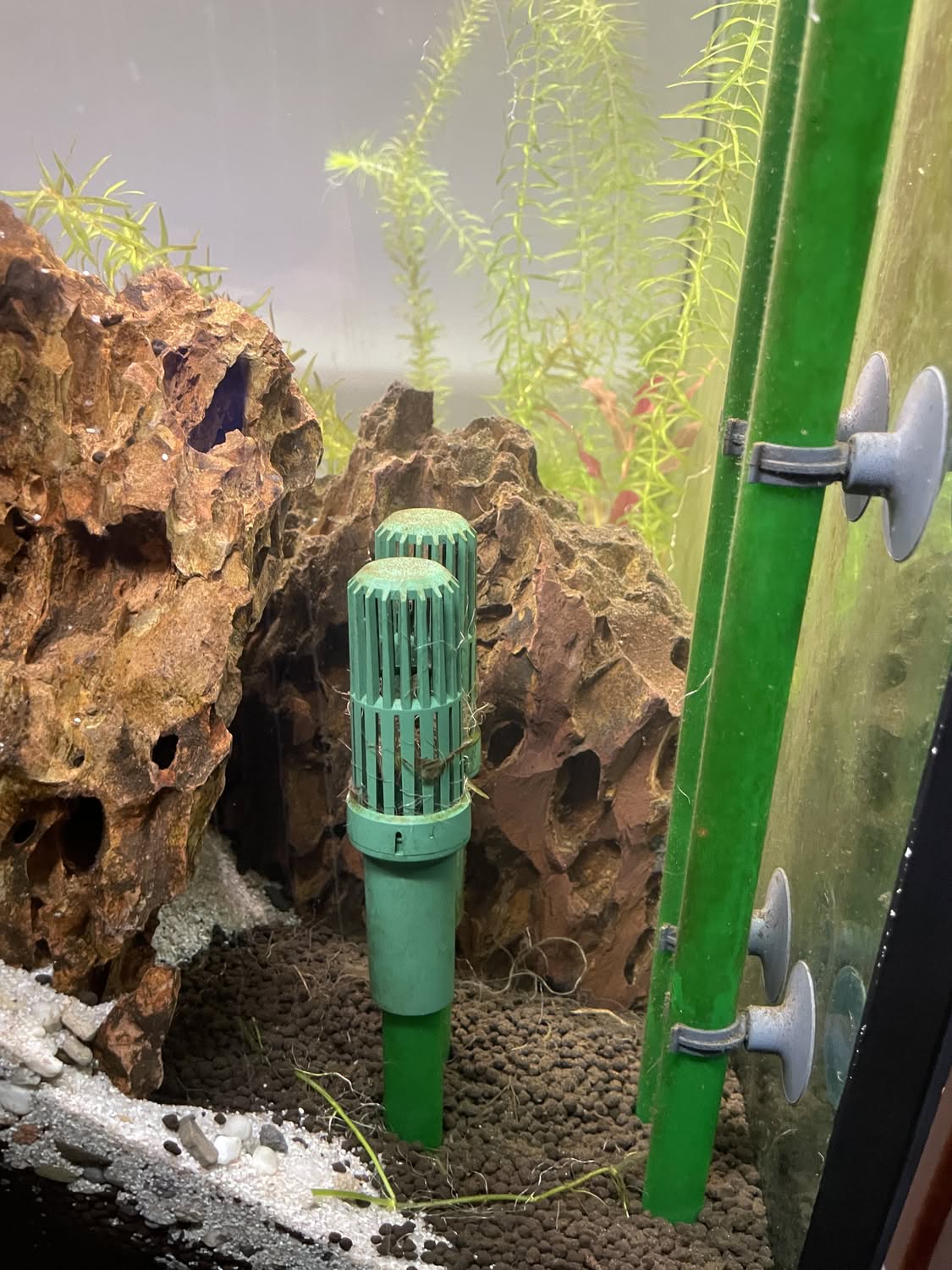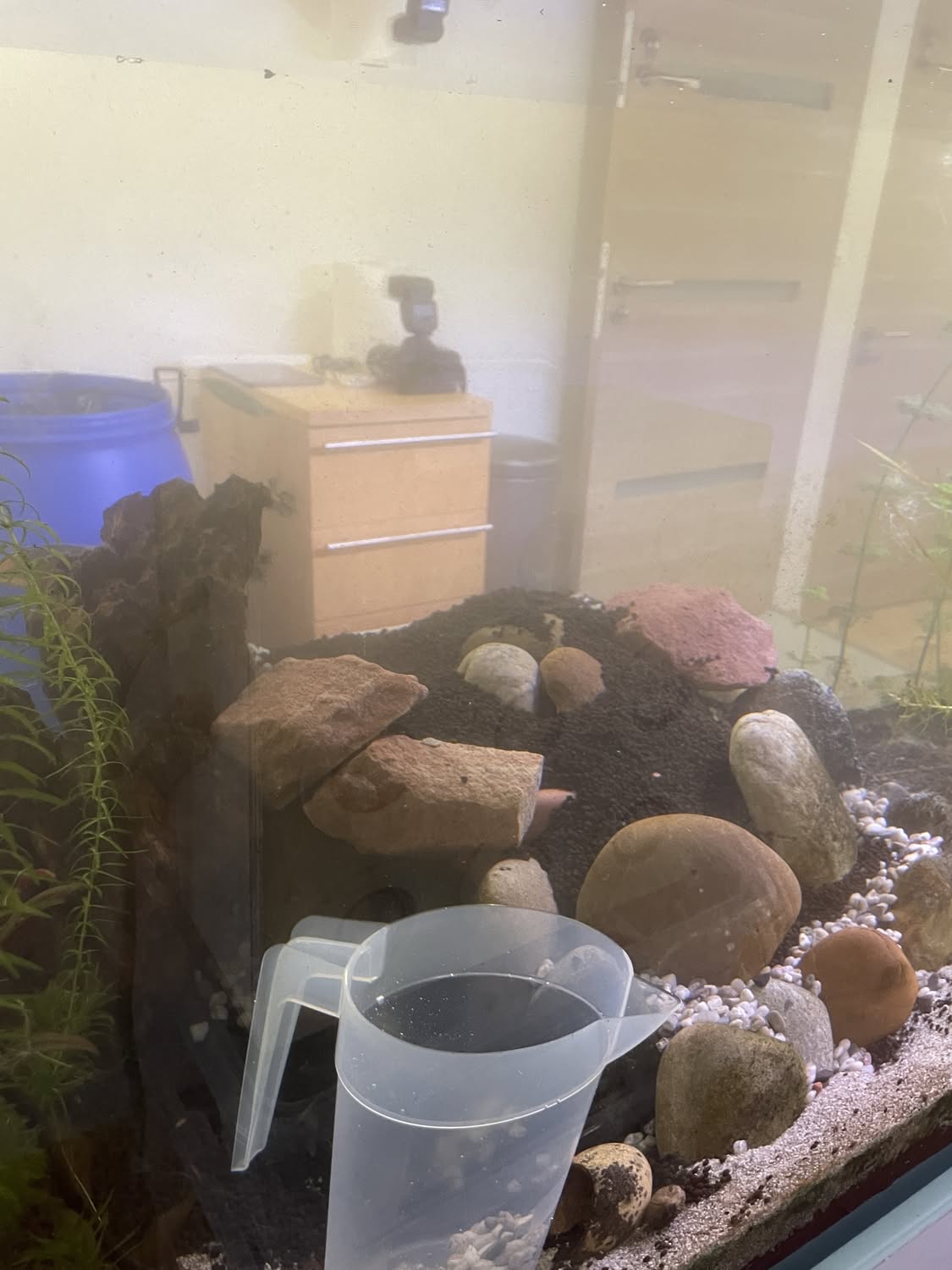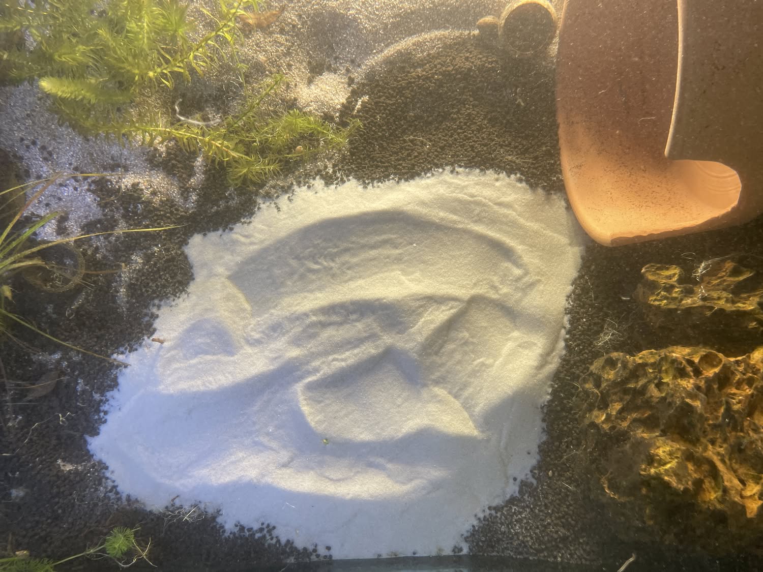 Pour la cyano coincée contre la vitre, je pense qu'elle est morte, mais je vais faire un test à un endroit. De ce côté je n'ai pas de lumière venant de l'extérieur c'est un couloir sombre, donc la lumière qui arrive dans le sable/substrat provient uniquement de l'éclairage du bac, par diffraction dans la vitre, donc cacher le côté extérieur n'aura pas d'effet. L'idéal serait de creuser le long de la vitre, je ferais un essai pour voir si c'est galère.