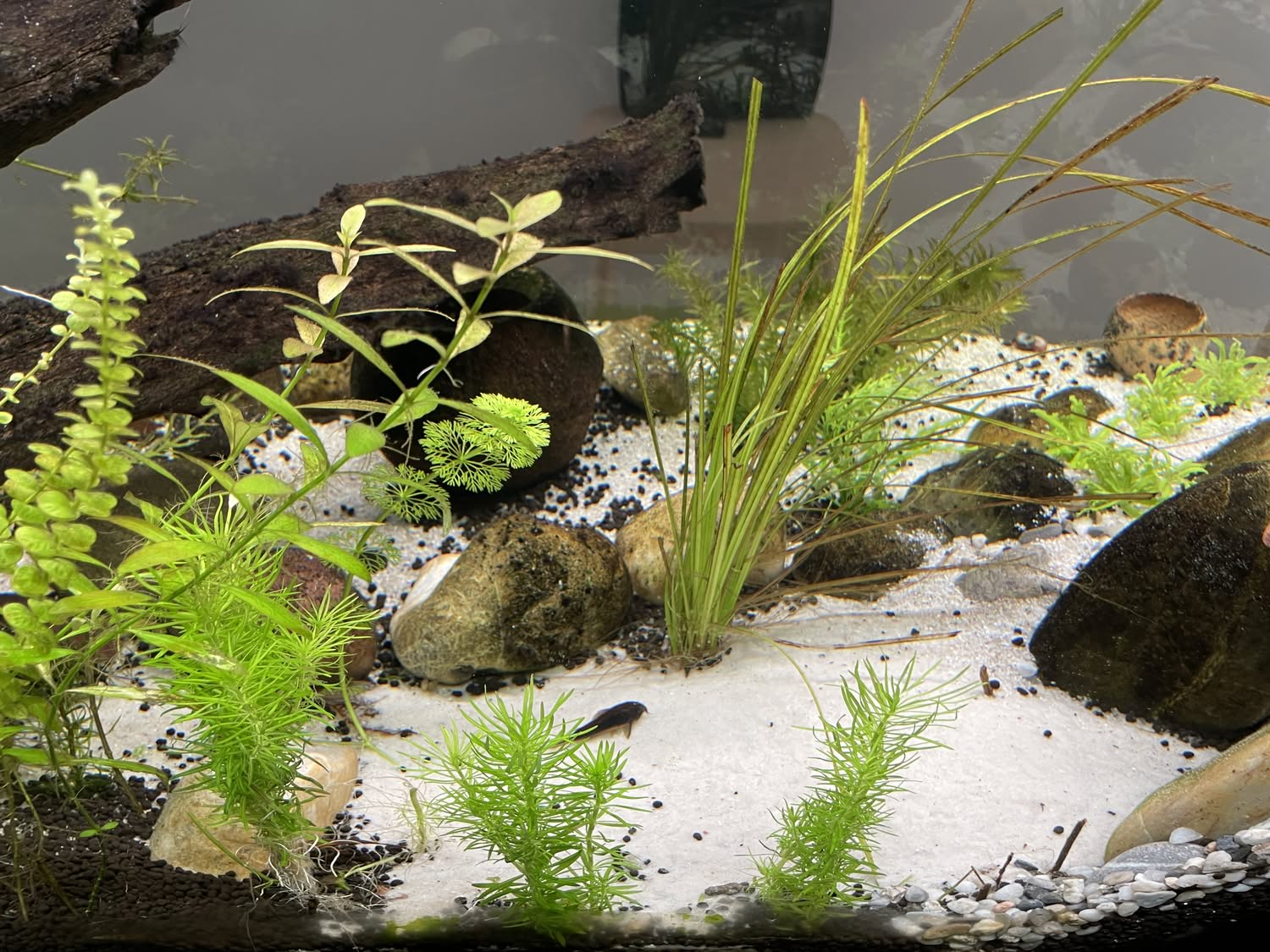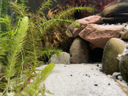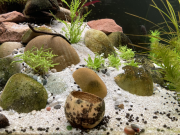 Mes crevettes vivent une nouvelle vie, je ne sais dire pourquoi elles sortent maintenant, je pense que c'est lié à la cyano qui prenait la place des algues, maintenant elles ont de quoi brouter toute la journée? Idem ma petite armée de Planorbe qui broute tout ce qui est vert, certains ont déjà grossi et ça se voit bien!