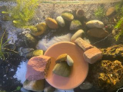 Après c'est la partie délicate, il faut déménager la zone, plantes, cailloux, pierres. J'ai retiré 150L d'eau que j'ai stocké qui permettait en même temps de stocker les plantes avec éventuellement des Planorbes dedans!